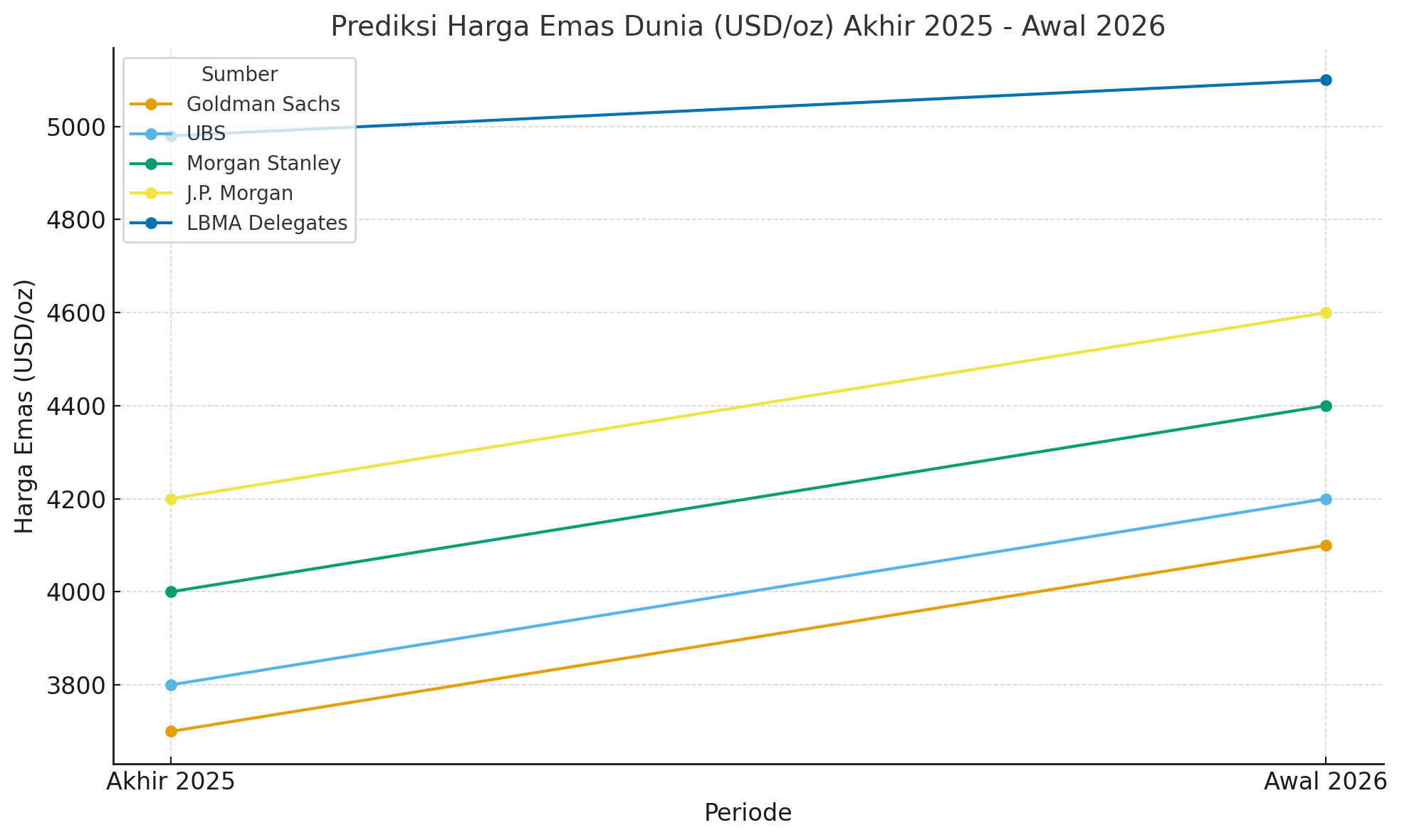 Prediksi ini datang dari berbagai lembaga ternama seperti Goldman Sachs, UBS, Morgan Stanley, J.P. Morgan, hingga delegasi London Bullion Market Association (LBMA). Meskipun angka prediksi berbeda-beda, semuanya sepakat bahwa tren bullish emas masih akan berlanjut hingga tahun depan.