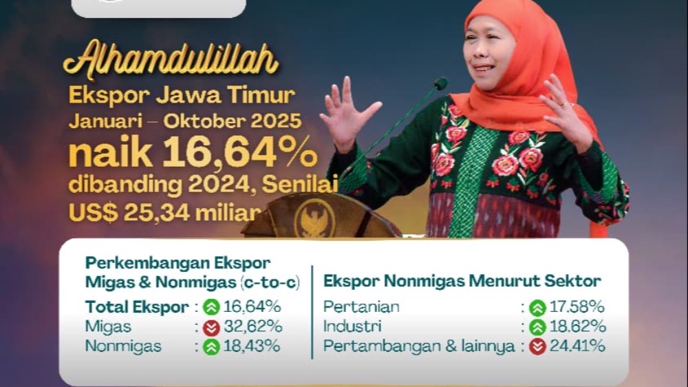 Kinerja ekspor yang terus menguat tersebut, menurutnya, memberikan dampak positif terhadap perekonomian Jawa Timur. Hal ini terlihat dari pertumbuhan ekonomi Jawa Timur pada Triwulan III-2025 yang mencapai 5,22 persen (y-on-y), lebih tinggi dibandingkan pertumbuhan ekonomi nasional sebesar 5,04 persen.