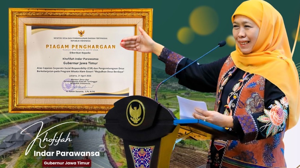 BISNISQUICK.COM – Surabaya, 24 April 2026 – Gubernur Jawa Timur Khofifah Indar Parawansa menerima penghargaan Corporate Social Responsibility (CSR) dan Pengembangan Desa Berkelanjutan (PDB) Award 2026 dari Kementerian Desa dan Pembangunan Daerah Tertinggal. Penghargaan ini diraih melalui keberhasilan Program Wisata Alam Gosari bertajuk “Wujudkan Desa Berdaya”.